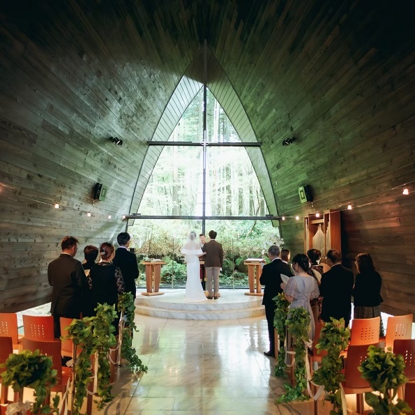 外は「石造り」、中は「木造り」で、一歩足を踏み入れた瞬間、木の香りに心を癒されます。天井高8mのチャペル祭壇に映る自然は四季折々の表情を見せながら幸せを誓うおふたりを優しく包み込みます。