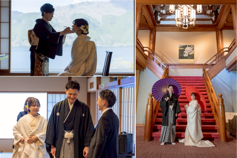 迎えた結婚式前日、ご家族は全員お隣のプリンスホテルに前泊。それぞれ温泉に入ったり、箱根観光へおでかけされたり、ゆっくり過ごして頂きました。そして当日の朝は、お天気もよく桜もほんのり咲いて、まさに結婚式日和となりました。早朝からの準備でしたが、会話もしながら楽しいお支度時間となりました。皆様のお支度も終えたら箱根神社へ出発です♪